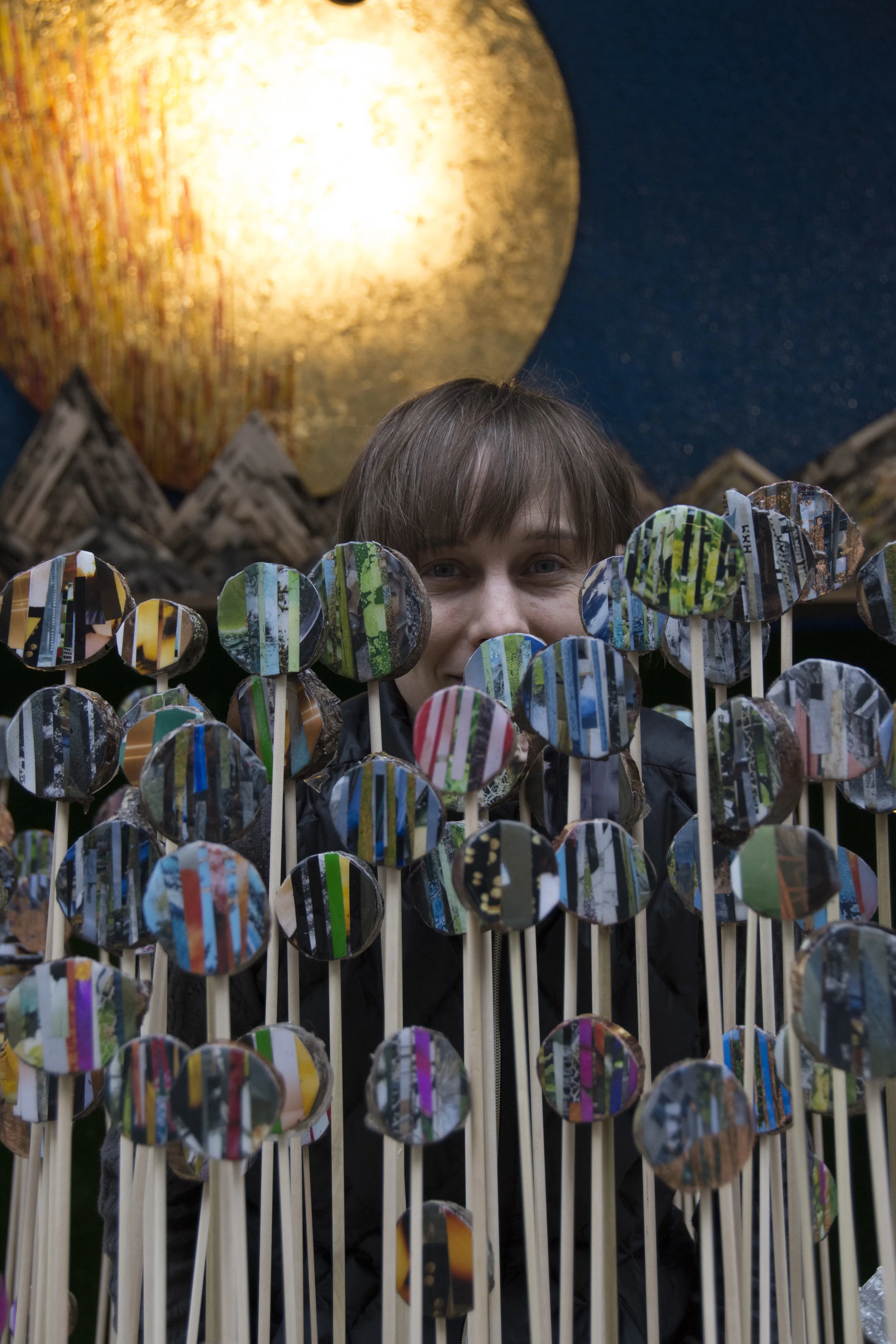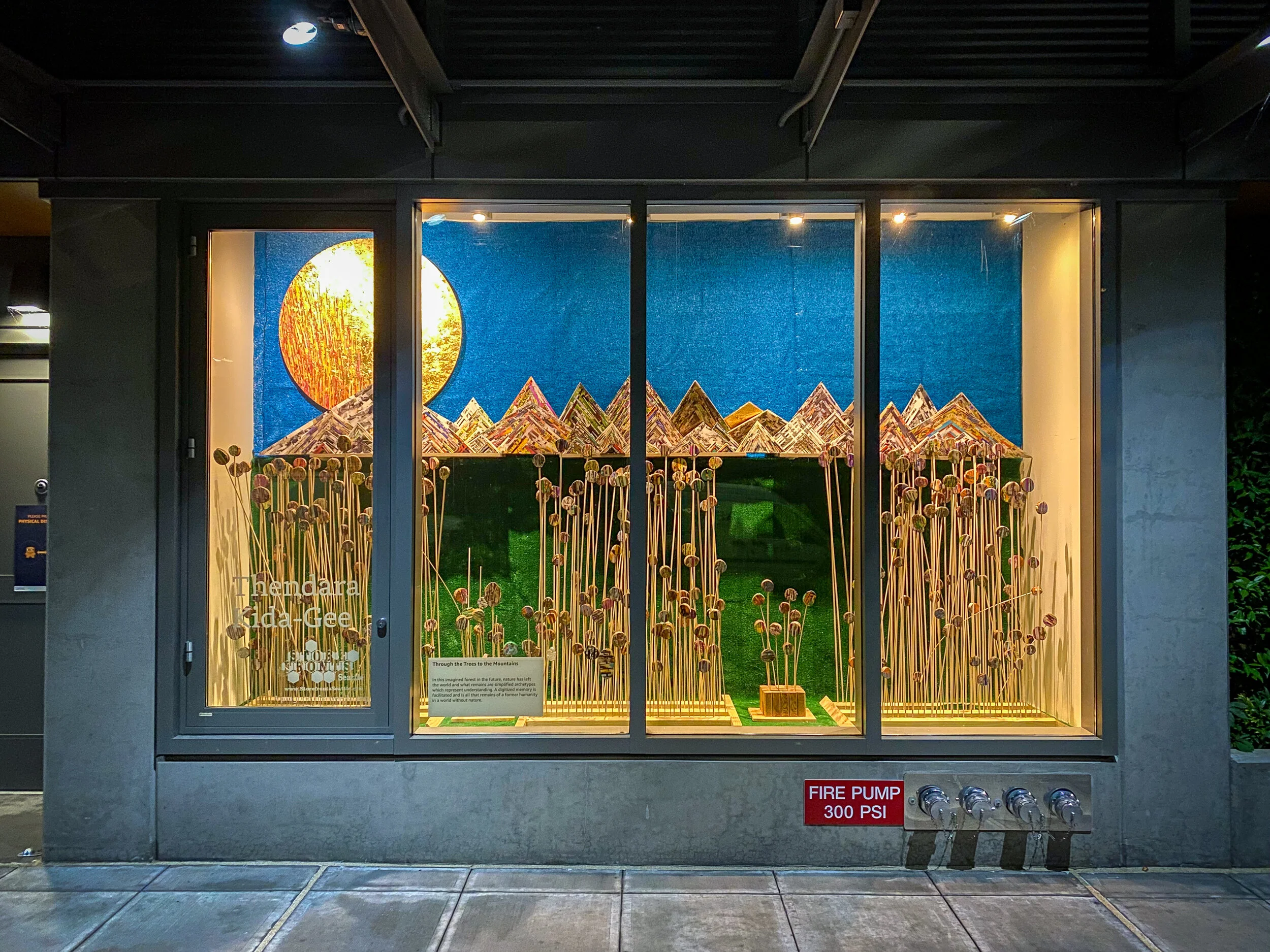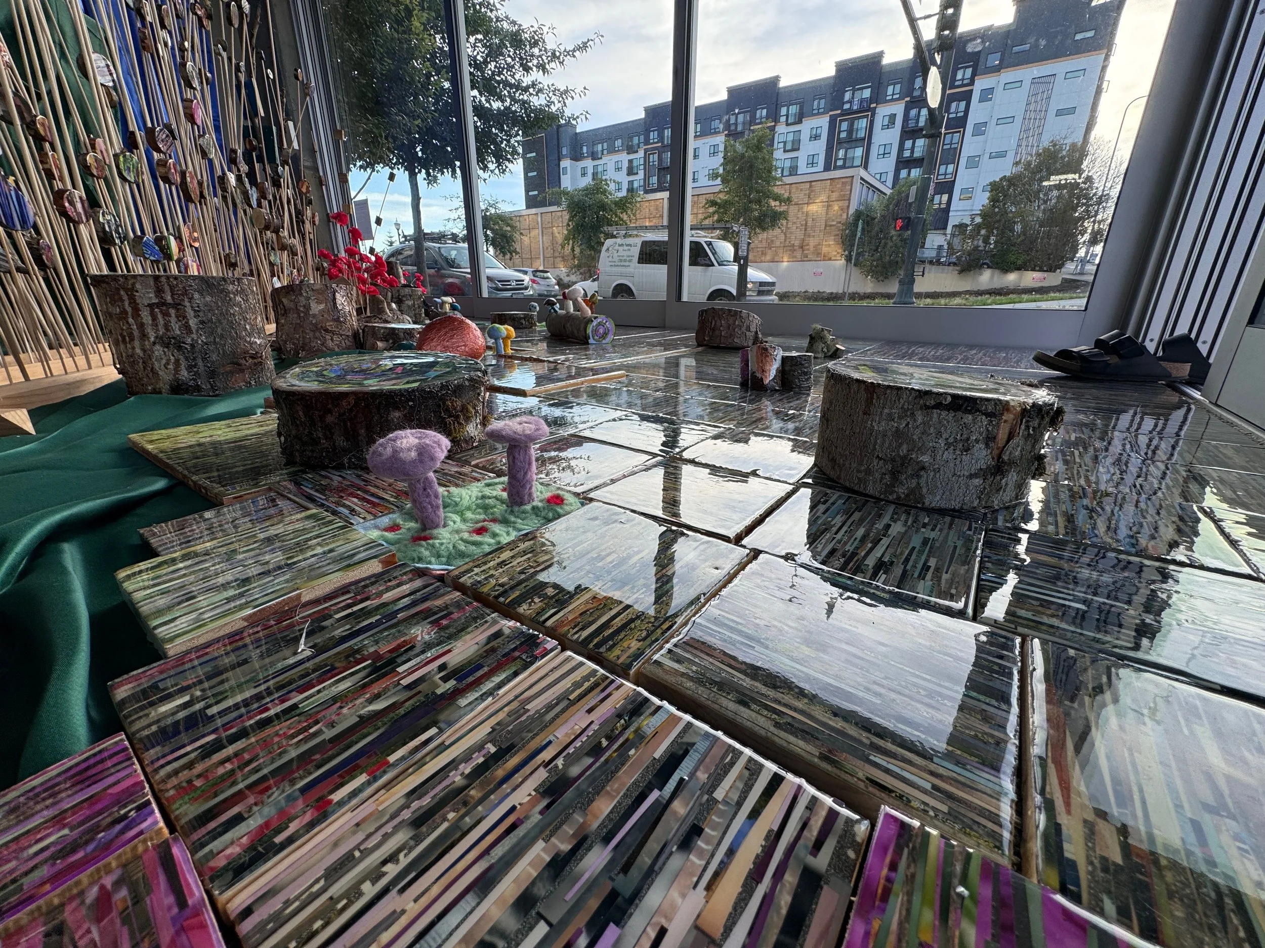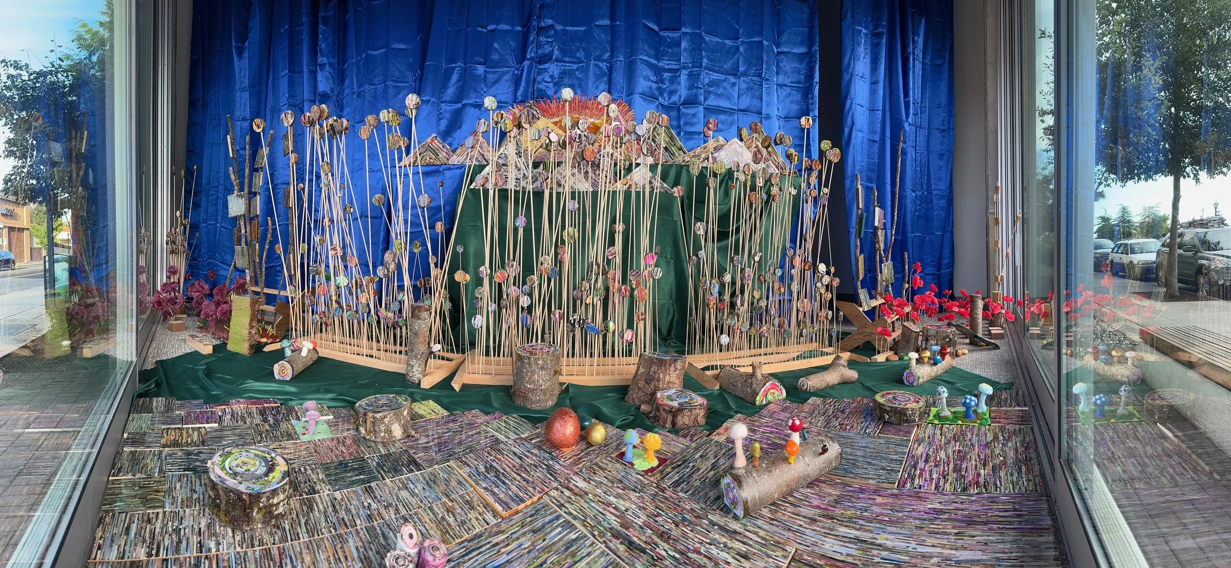 We completed installation a day early, yesterday. Really happy with how it turned out. The hanging of the fake green and blue lawn was the biggest pain in the butt of the whole event, other than that it tended to be mild repetitive activity, quite a bit of it but we got there in the end. Just in time for it’s opening tmrw 4/20 - great show to see which or without enhancements! Also seems really great to be exhibiting for Earth day. Please visit my forest if you can - always open and right next to Gosankos chocolate shop on 1 East main, Auburn you’ve got until July 7th, 2019.