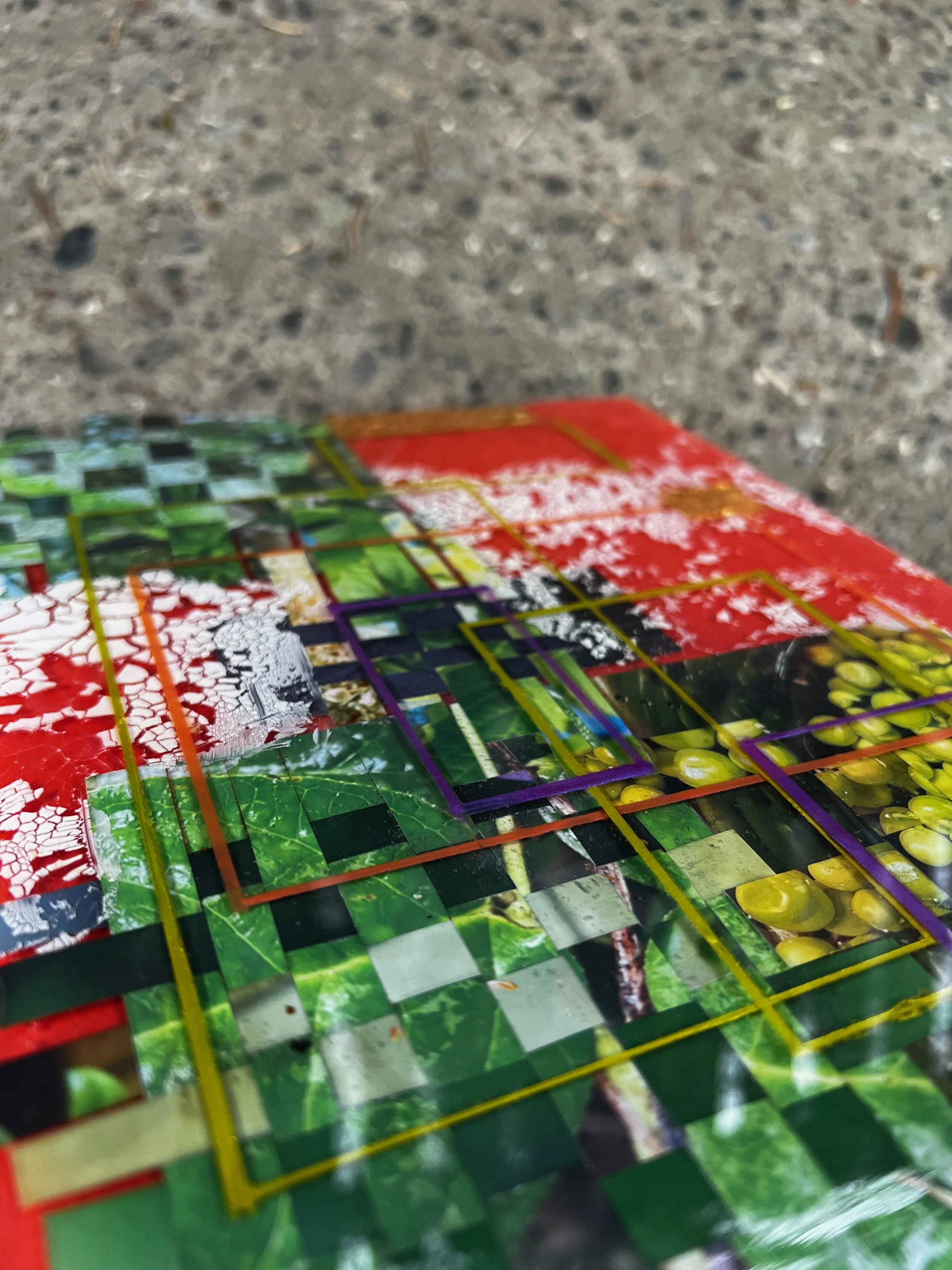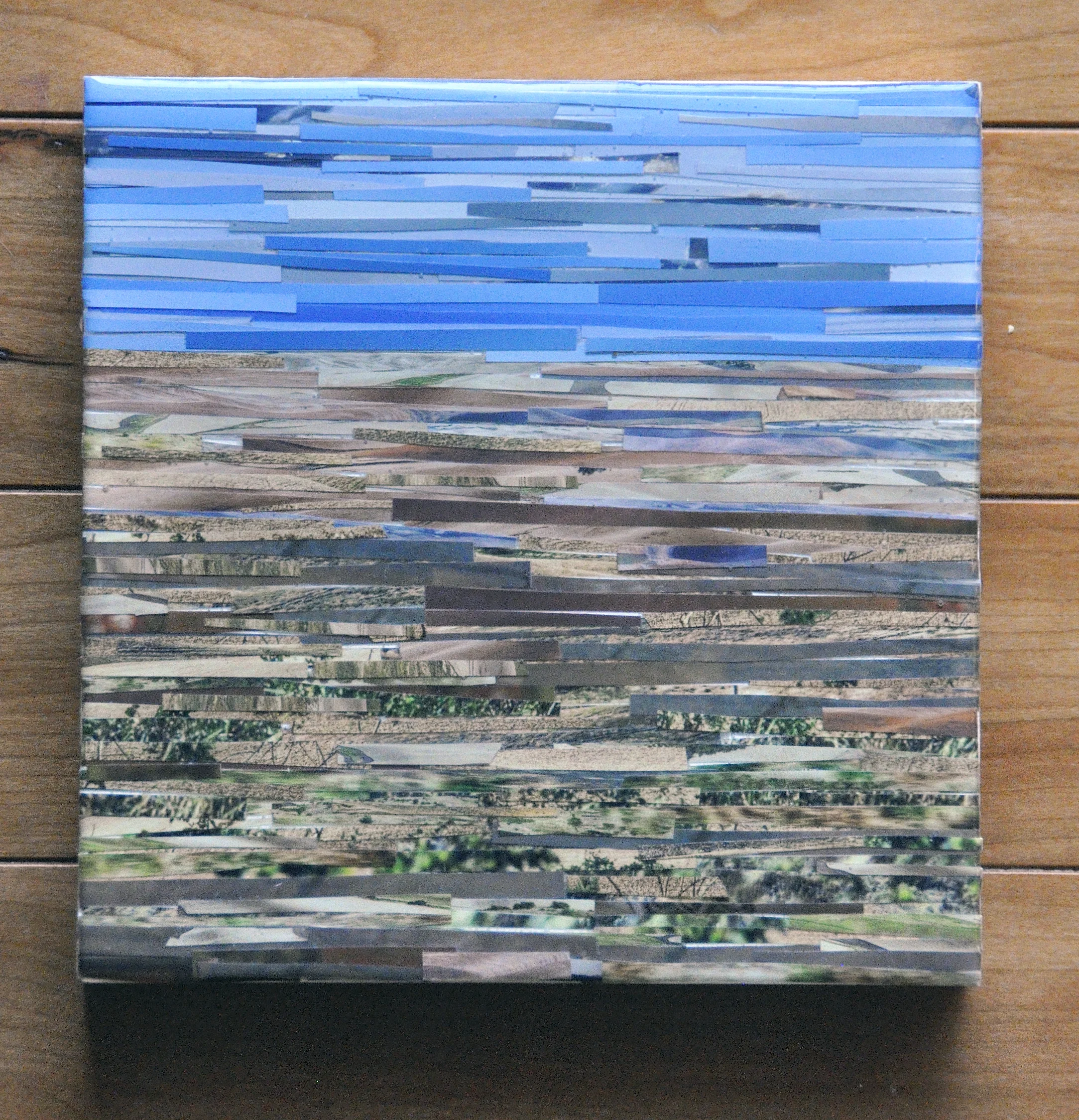 Recycled Landscapes of the Palouse; photographic collage , coated in Jewelers grade resin.