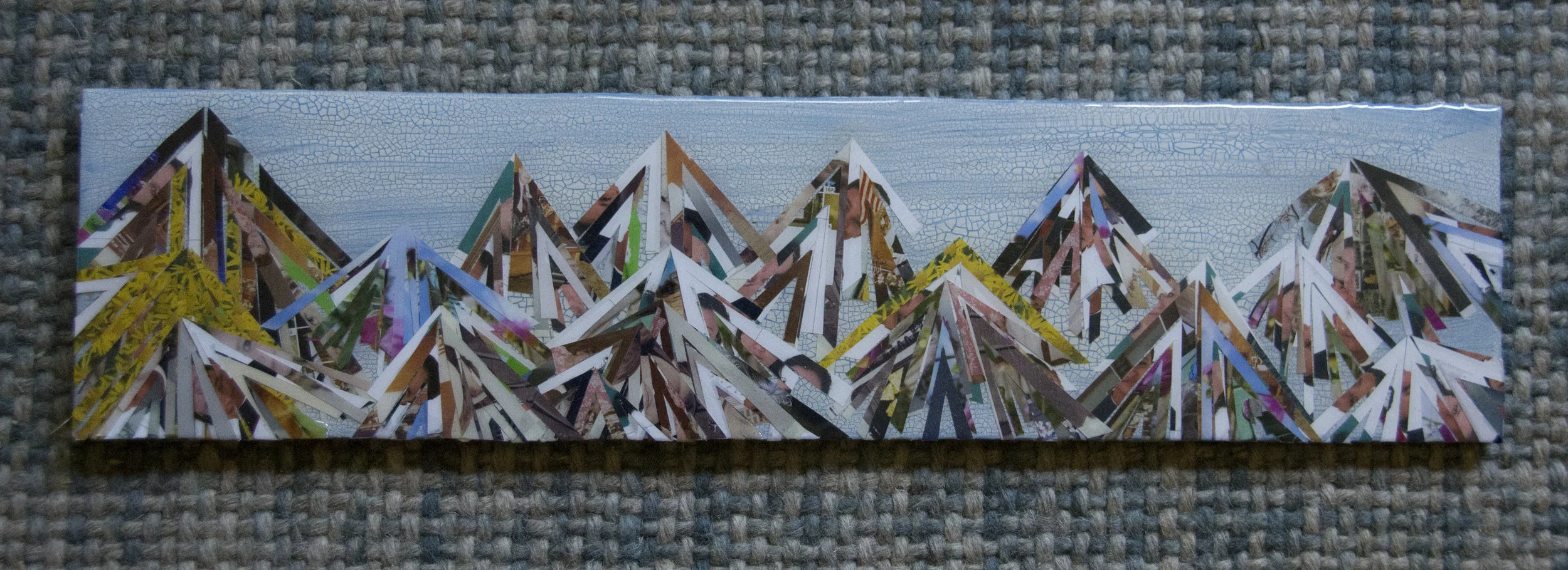 An old cupboard door has become rich with texture and a collaged mountain range with many layers. 15”x3’6” 2022