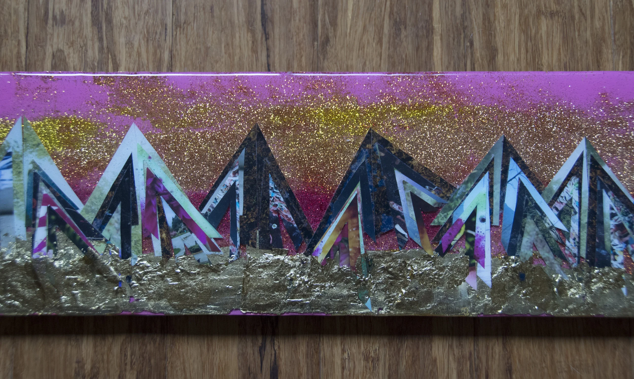 First piece 8”10” second piece 8.5”x24” collage and paint on wood with resin. 2021
