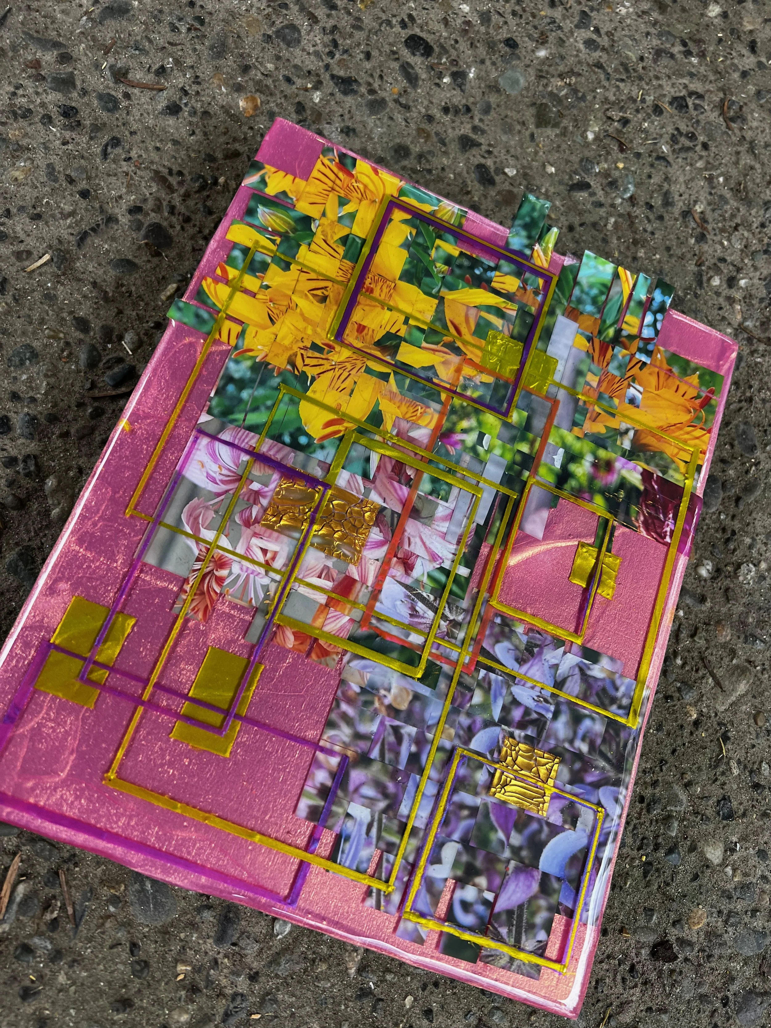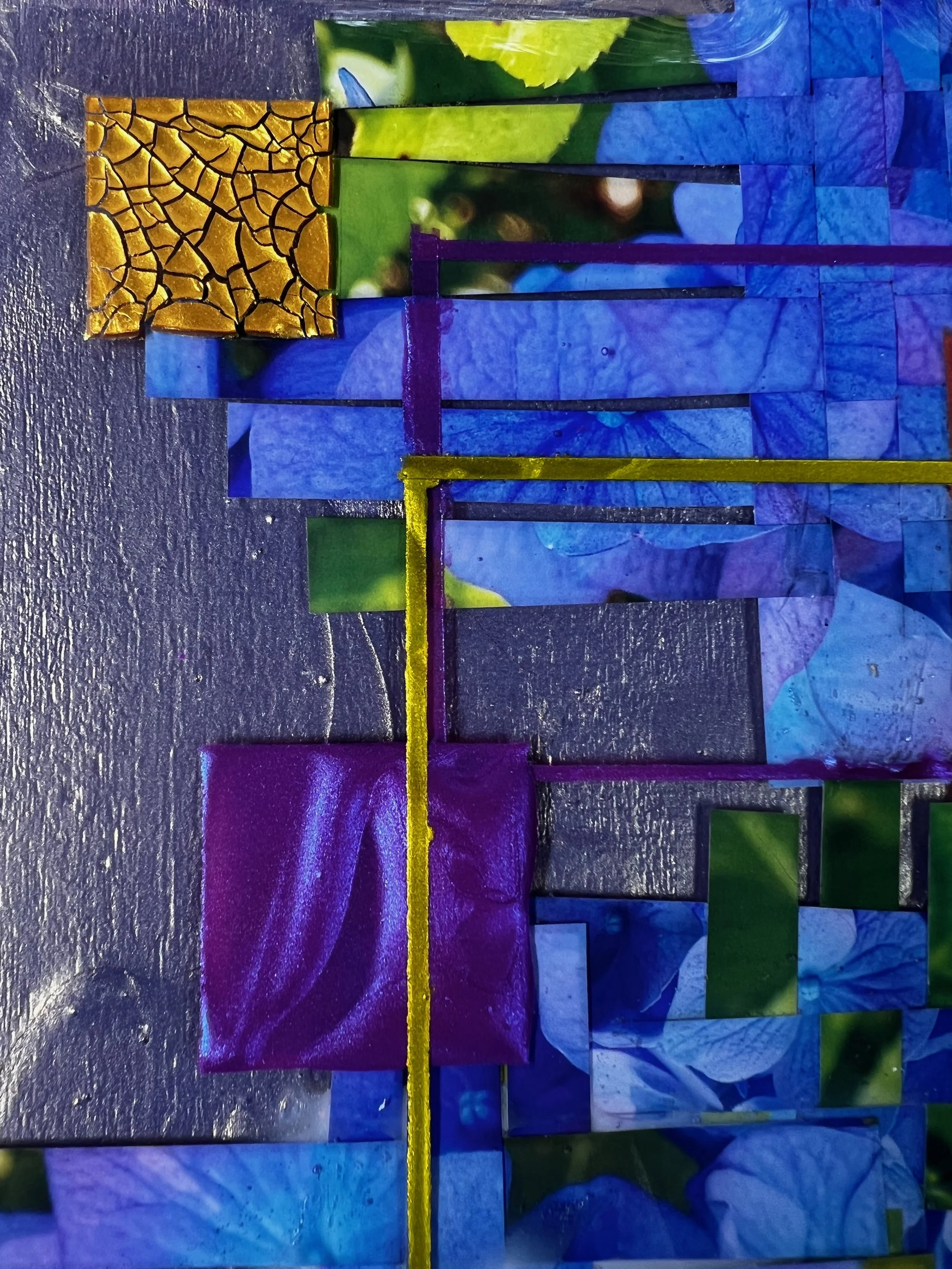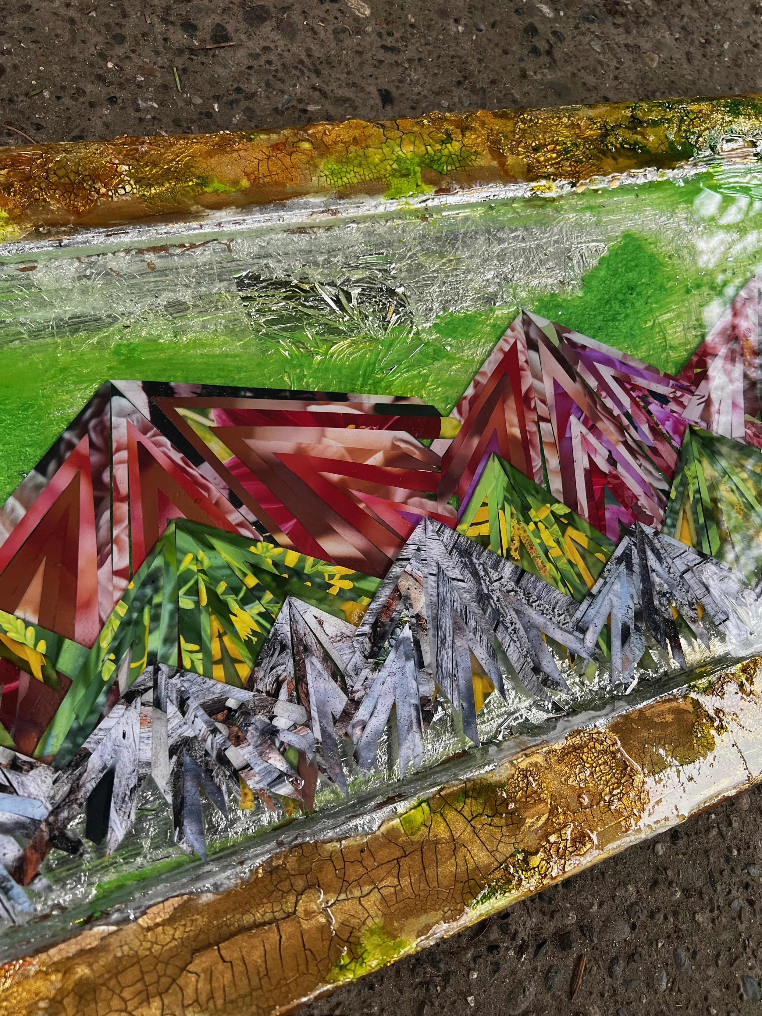 8”x6” phtotographic collage, paint, resin on wood base, 2023